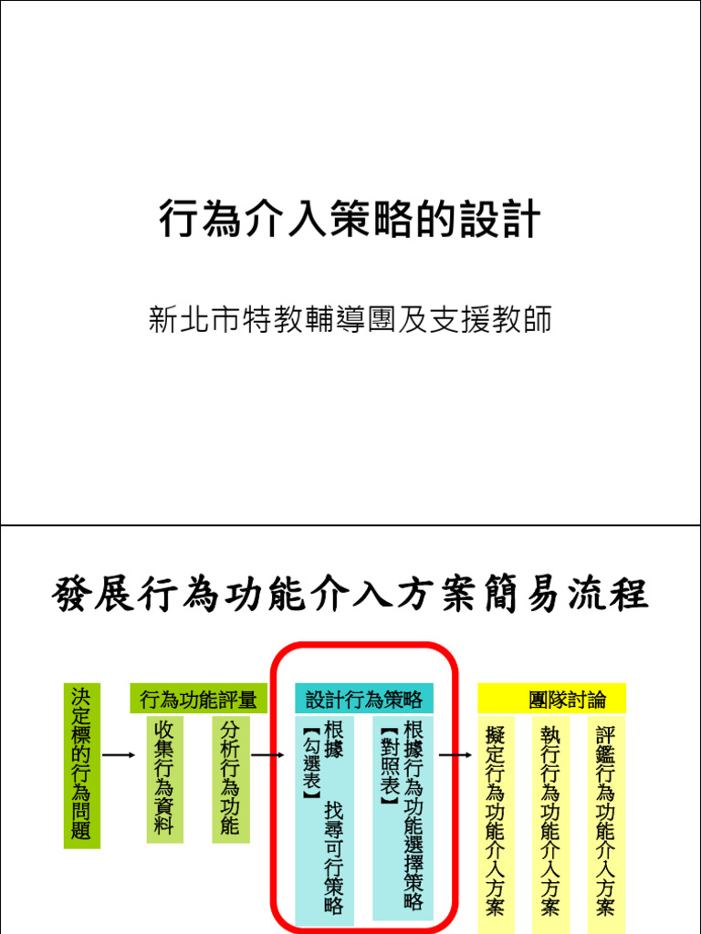 行為功能分析與評估:根據收集的資料,分析行為的功能(如逃避、獲得注意、感覺刺激等),並撰寫行為功能介入方案,方案中需包含具體的介入策略、執行人員、時間與方式。