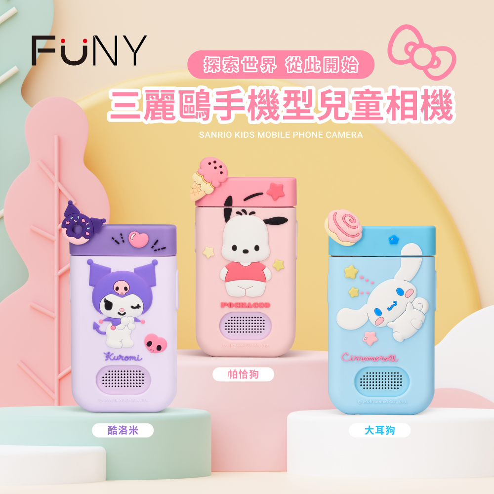 手機型兒童相機系列:由FUNY官方授權,包含大耳狗喜拿、酷洛米、帕恰狗等多款人氣角色,設計貼近手機外觀,方便兒童操作,兼具趣味與實用性,是2025年首款正版授權的三麗鷗手機型兒童相機。