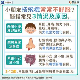 此外,避免讓嬰幼兒過量飲食以免腸胃不適,且不建議使用昏睡藥物。若孩子已有耳鼻喉疾病,建議事先諮詢醫師,必要時可配合藥物治療。