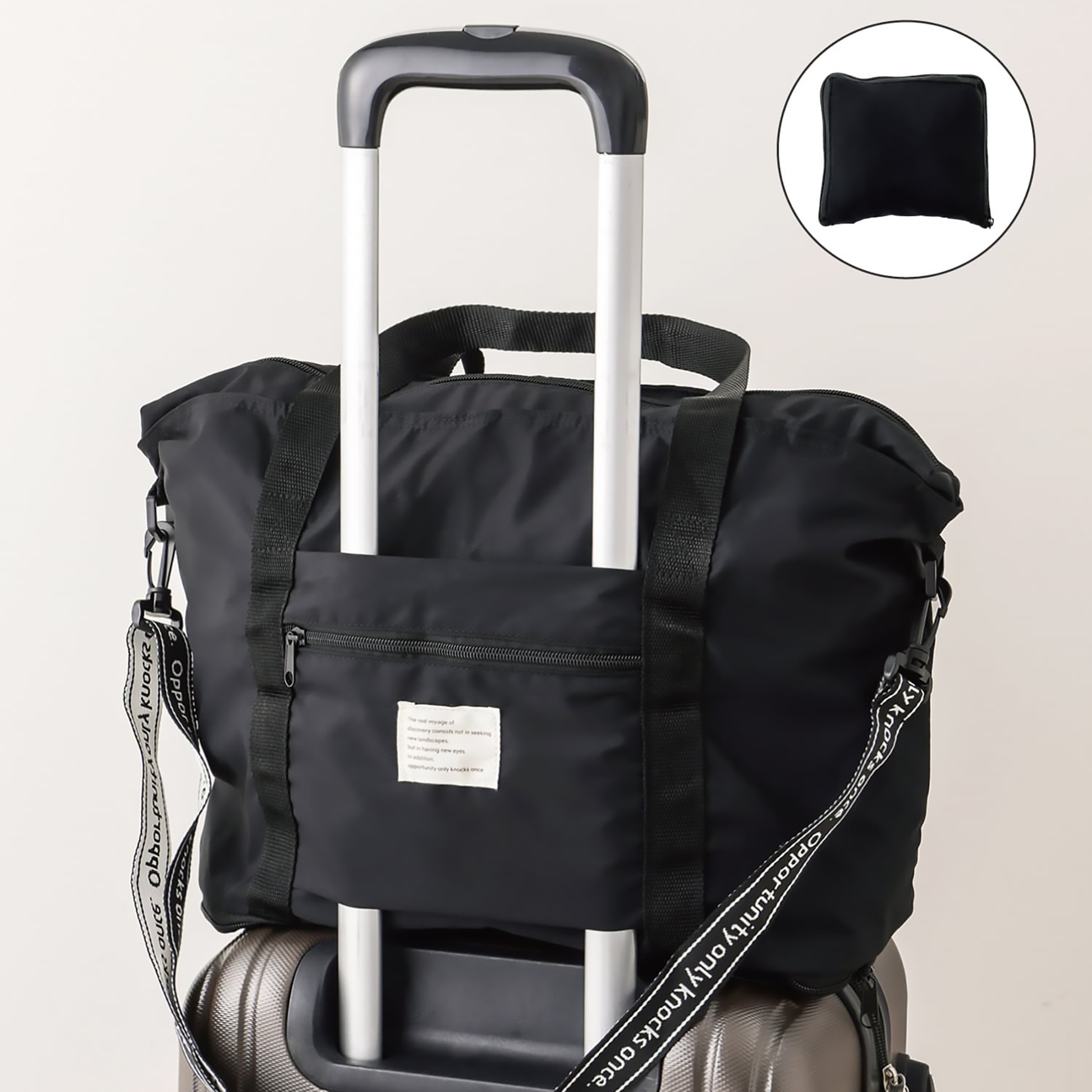 輕量可收納行李袋:底部拉鍊可展開增加容量,適合存放一兩晚的換洗衣物和旅行用品。設計有分割區方便整理,採用雙向背法(肩背或手提),繩子較粗減少肩膀負擔,且可折疊收納。