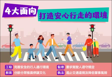 行人優先交通安全行動綱領與行人交通安全政策綱領(2023-2027),強調從都市整體運輸系統規劃出發,整合公共運輸與人行環境,推動短期至長期執行項目,目標在2030年前降低道路交通事故死亡人數30%,並朝向「零死亡願景」邁進。