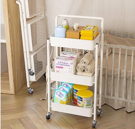 - 多層推車方便將不同類別物品分層擺放,提升收納效率,且推車可移動的特性讓使用者能靈活調整位置,增加使用彈性。