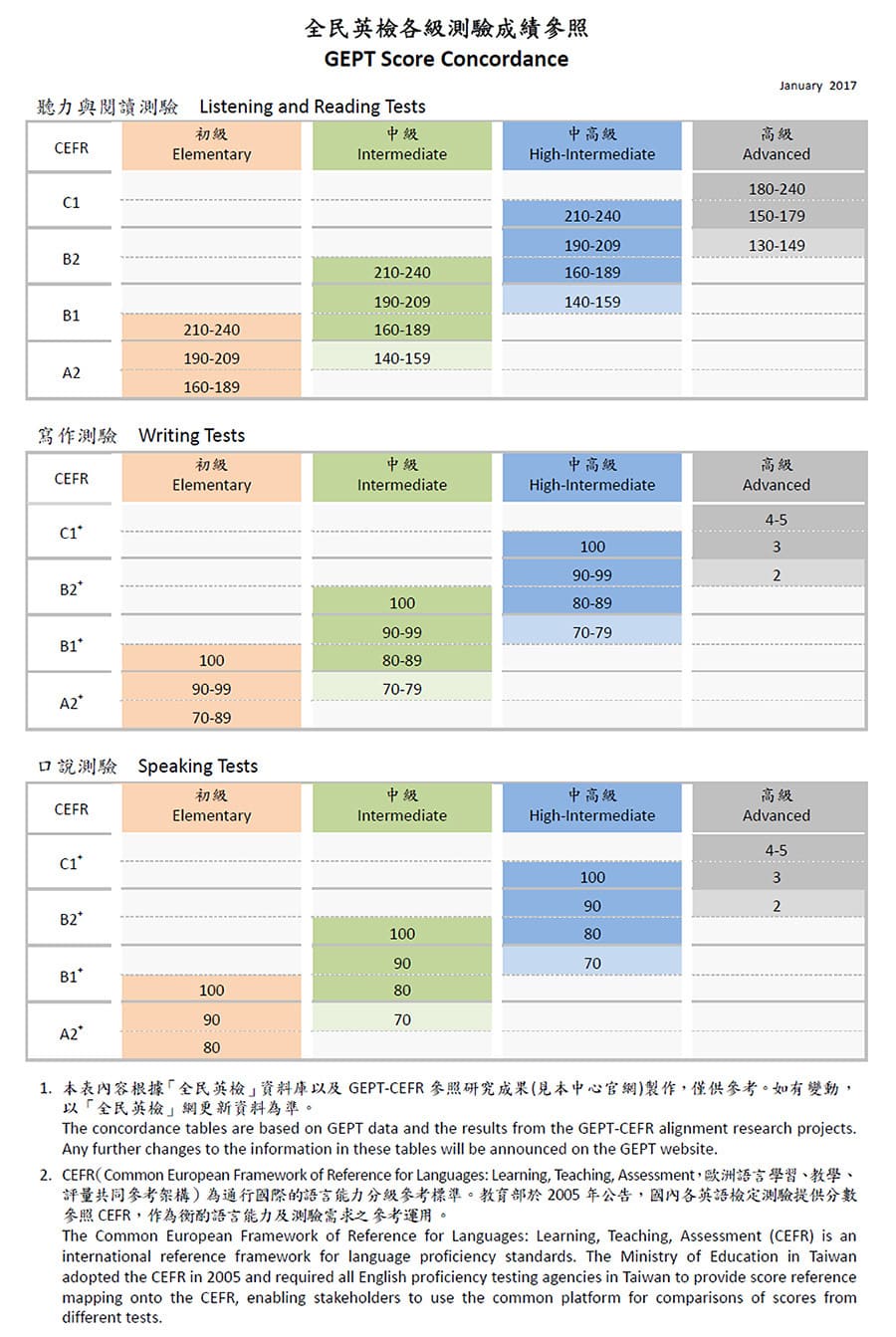 全民英檢 (GEPT) | 分初級、中級、中高級等級,分初試(聽力、閱讀)與複試(寫作、口說)兩階段 | 聽力、閱讀、寫作、口說 | 初級:聽力約20分,閱讀35分,寫作40分,口說約10分中級:聽力約30分,閱讀45分,寫作40分,口說約15分中高級:聽力約35分,閱讀50分,寫作50分,口說約15分 | 初試與複試分開,口說時間較短 |