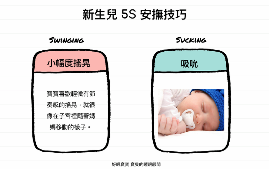 5S安撫法:包巾包裹、側臥抱、噓聲、搖晃、吸吮,幫助寶寶安定情緒。