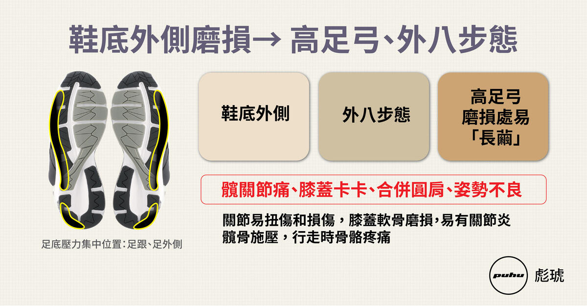 - 外側磨損:外八字走路,易導致圓肩、下背痛,並增加膝蓋軟骨磨損與關節炎風險。