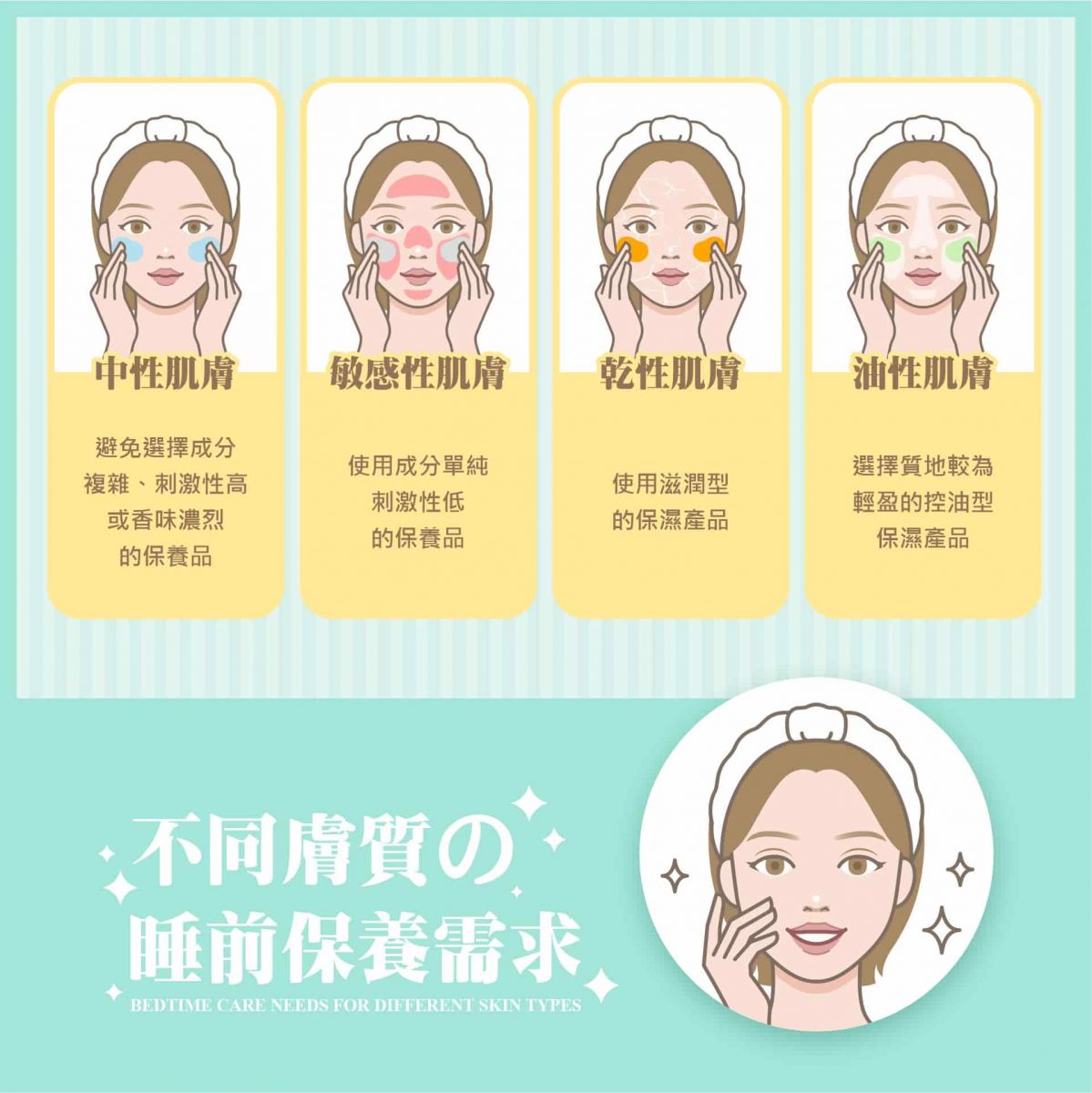 - 乾性肌膚:適合使用富含玻尿酸、神經醯胺、乳木果油等成分的濃厚晚霜或睡眠面膜,能深層補水並加強皮膚屏障,鎖住水分,減少細紋產生。