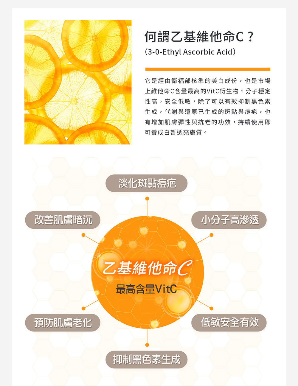 - 維他命C本身也有助於減少痘疤與痘印,因其抗氧化與美白效果。