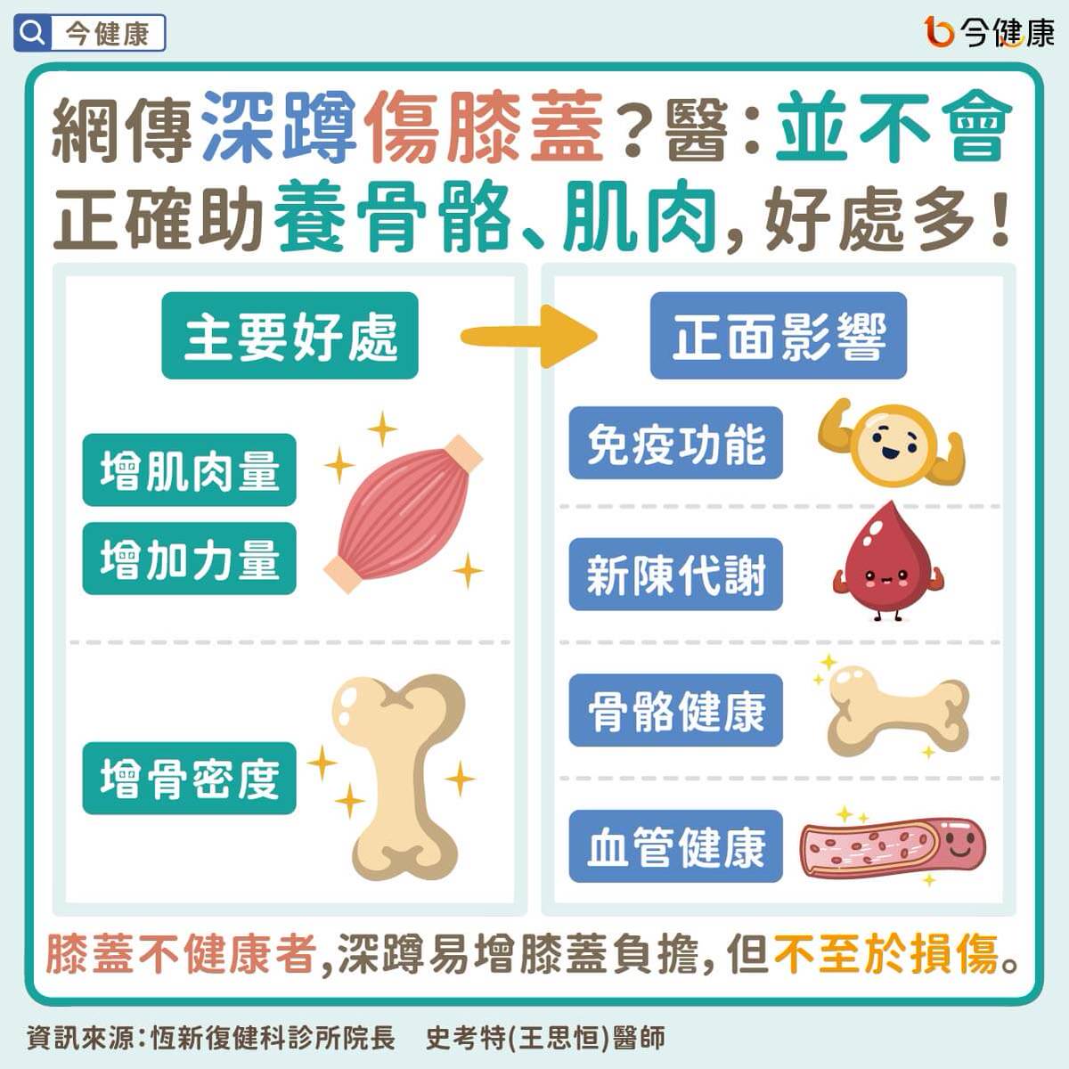 深蹲等負重運動能促進膝蓋關節活動範圍,強化大腿前後肌群及臀肌,改善平衡感,並有助於維持骨密度,對預防骨質疏鬆及膝關節退化有益。