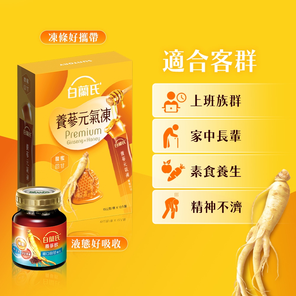 - 產品特色:養蔘元氣凍是白蘭氏首度推出的人蔘與蜂蜜完美搭配的果凍,果凍口感Q彈,蜂蜜帶來馥蜜甘甜,結合人蔘的元氣補給,適合想隨時補充元氣又喜歡甜味的人。