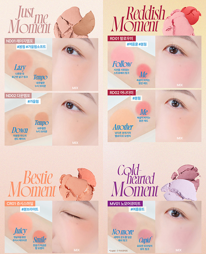 Fwee雙色腮紅的顏色以低飽和、不飽和色系為主,適合新手使用且不易失手,色調偏清淡且可自行調整鮮豔度,像RS02色號非常萬用百搭,MV02則帶紫色調較特殊。質地方面,雙色腮紅呈現霜狀偏粉感(霜轉粉),延展度佳,抹開後有微微模糊紋理,觸感介於舒芙蕾和歐姆蛋之間,帶有回彈感,且不黏膩,適合油肌或不喜歡腮紅膏黏膩感的人。