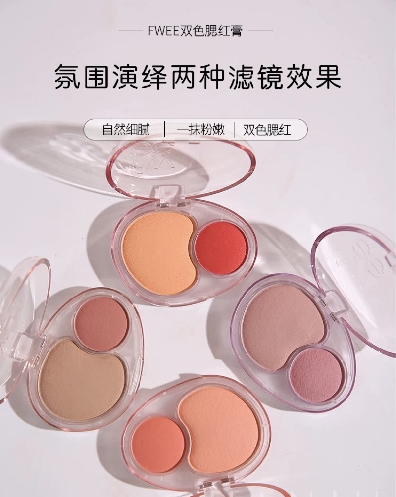 - 包裝設計:雖然雙色腮紅的包裝較為簡單,沒有過度華麗的外觀,但fwee品牌其他產品如唇頰膏則採用磨砂玻璃瓶身搭配色彩瓶蓋,質感較高,整體品牌形象偏向溫柔可愛且實用。