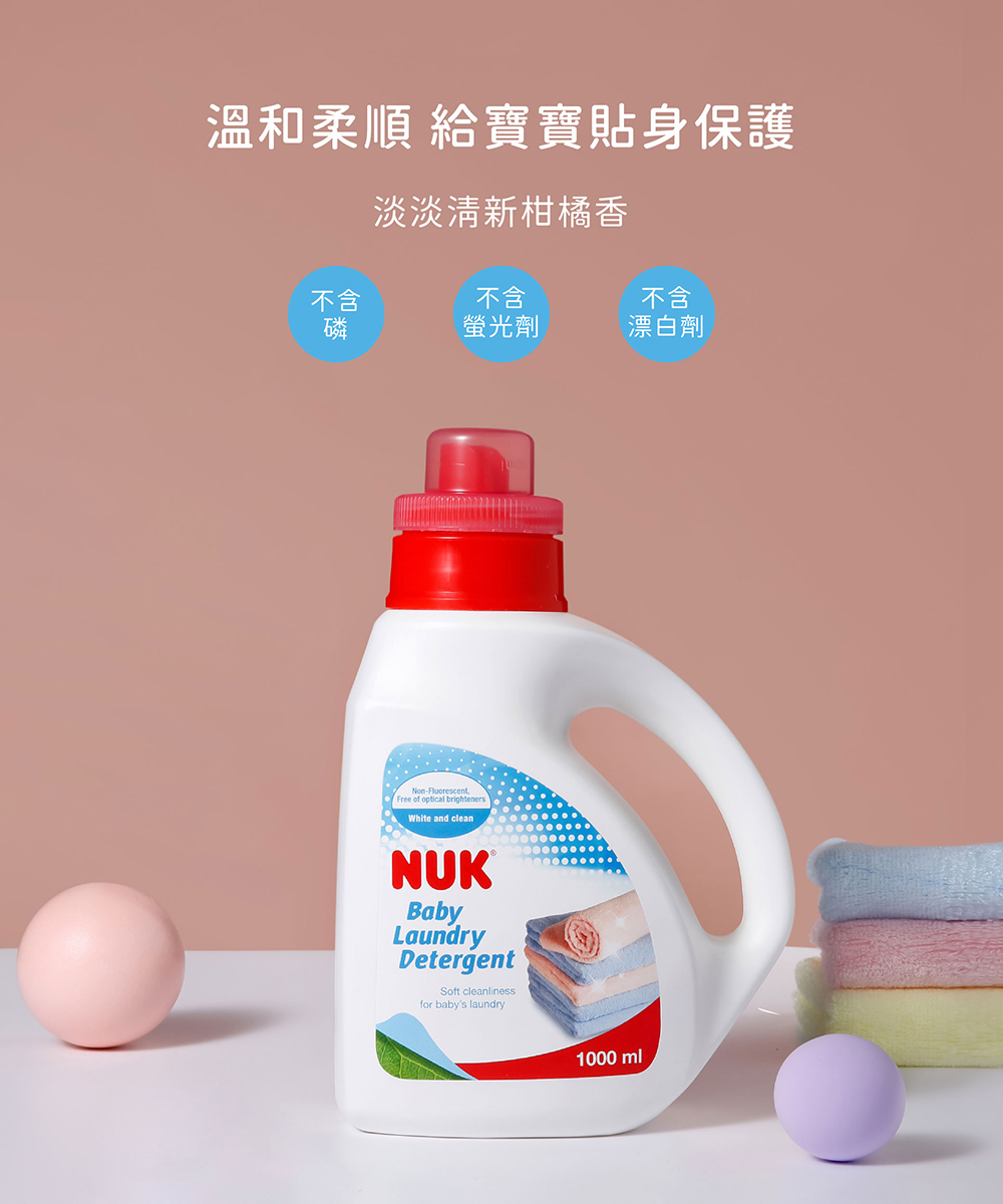 NUK嬰兒洗衣精:德國品牌,pH7中性配方,不含磷、螢光劑、漂白劑及人工色素,泡沫細膩易沖洗,避免衣物殘留異味,瓶口防漏設計方便控制用量,深受家長好評。