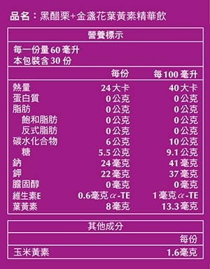 - 黑醋栗葉黃素產品葉黃素含量偏低,建議搭配其他葉黃素補充品或多攝取綠色蔬果。