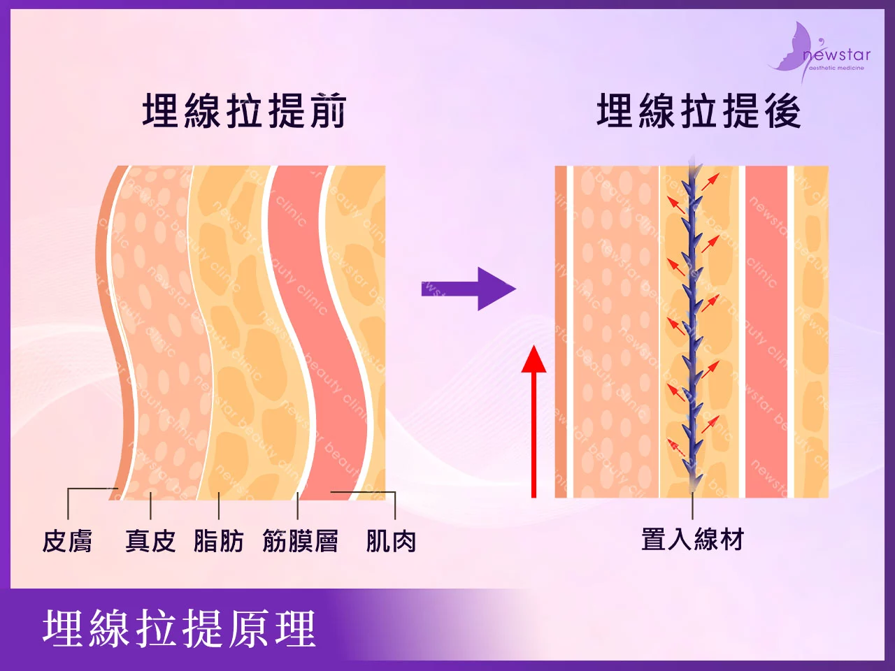 埋線拉提的原理是利用可被人體吸收的醫療線材,透過微創技術將帶有倒鉤的線材埋入皮膚深層,倒鉤設計可抓住皮下組織,對鬆弛下垂的皮膚產生拉提效果;同時,線材作為異物會刺激膠原蛋白增生,促進皮膚緊實與改善質地,效果會隨著膠原增生在3至6個月內逐漸顯現。