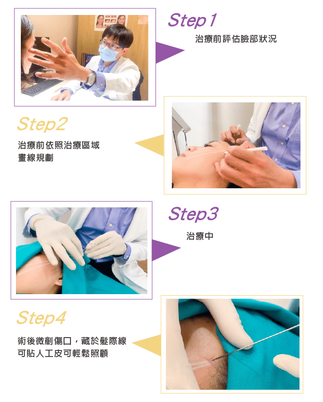 埋線拉提(線雕拉提):微創療程,將特殊倒鉤線材埋入皮膚下,直接拉提鬆弛組織並刺激膠原增生,適合希望明顯提升臉部輪廓且接受微創療程者,過程舒適且恢復期短。