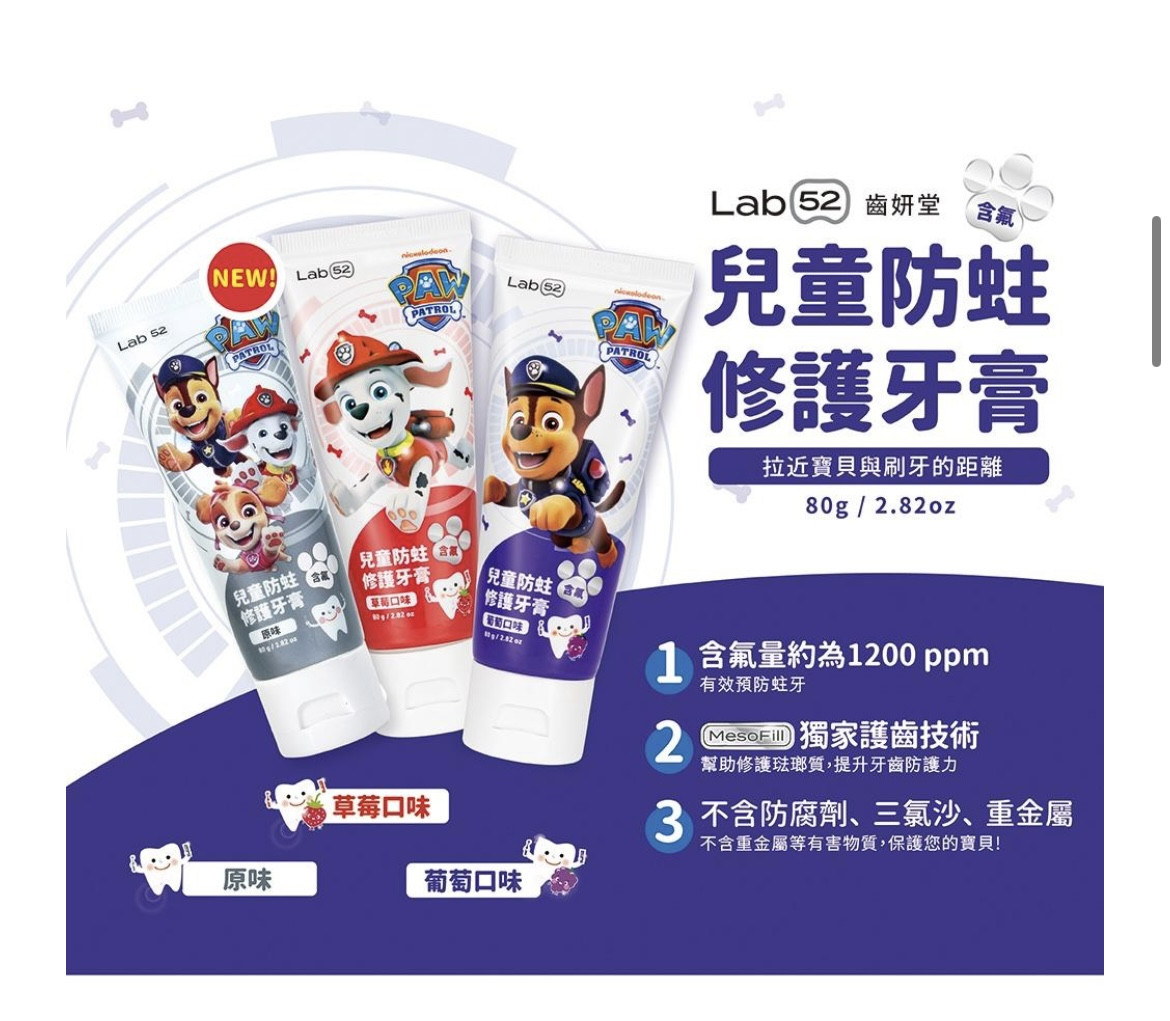 Lab52 齒妍堂 兒童含氟防蛀修護牙膏 | 1200 | 3 歲以上 | 修護琺瑯質、強化乳牙、防蛀 | |