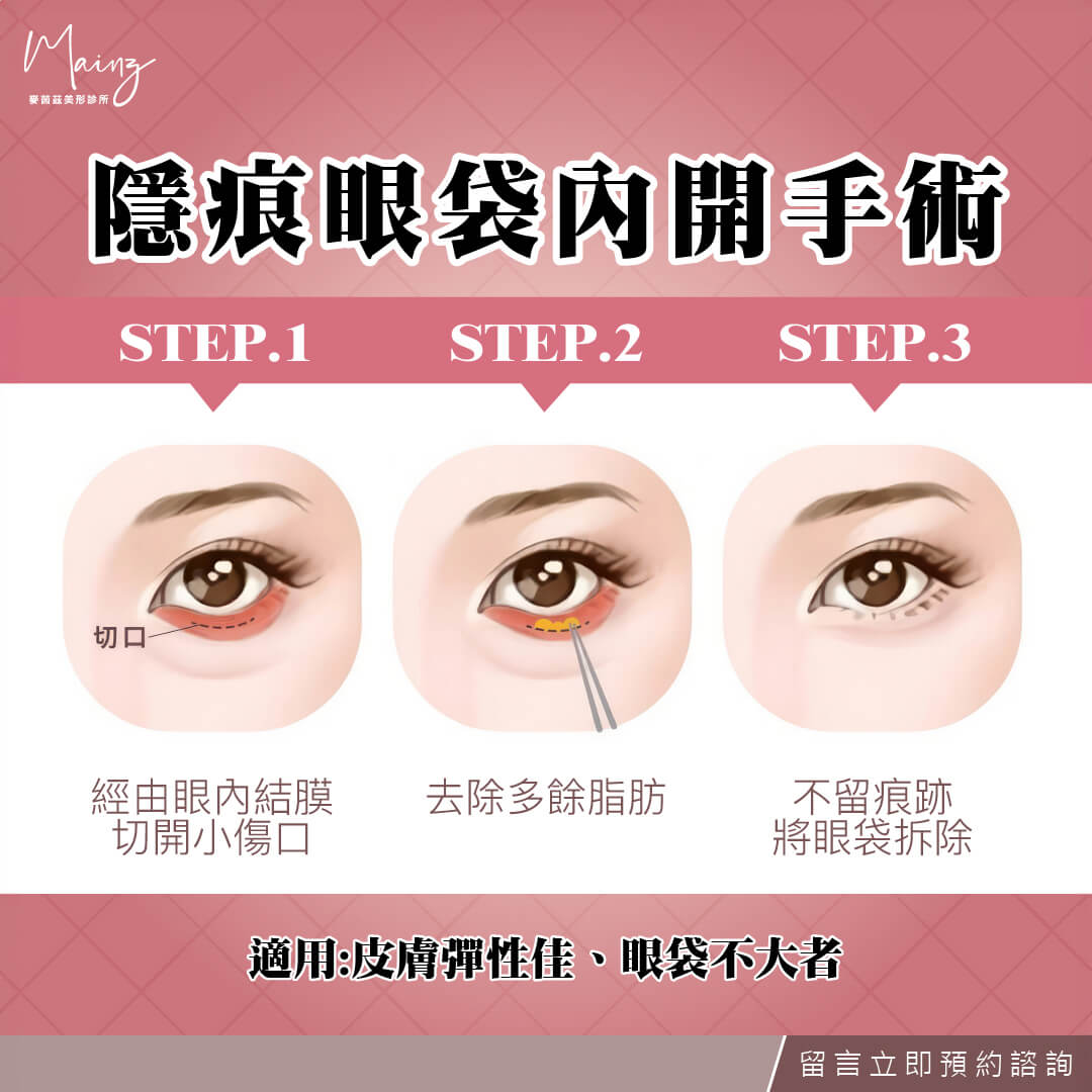 - 無外部疤痕:切口位於下眼瞼內側,皮膚表面無明顯傷口,外觀自然不易被察覺。