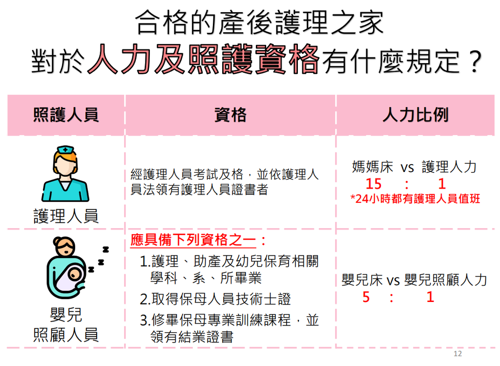 護理人員與嬰兒照顧比例對產後護理之家評鑑合格具有重要影響。 根據《護理機構設置標準表》規定,新生兒照顧人員需符合1:5的護嬰配比(即每5個嬰兒床應設置1位嬰兒照護人員),此比例是評鑑合格的基本法規要求。
