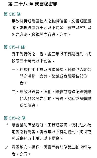 所以,刑法第315-1條嚴格限制在未經同意且無正當理由下,對他人非公開活動進行錄影等竊錄行為,以保障個人隱私權及秘密通訊自由。