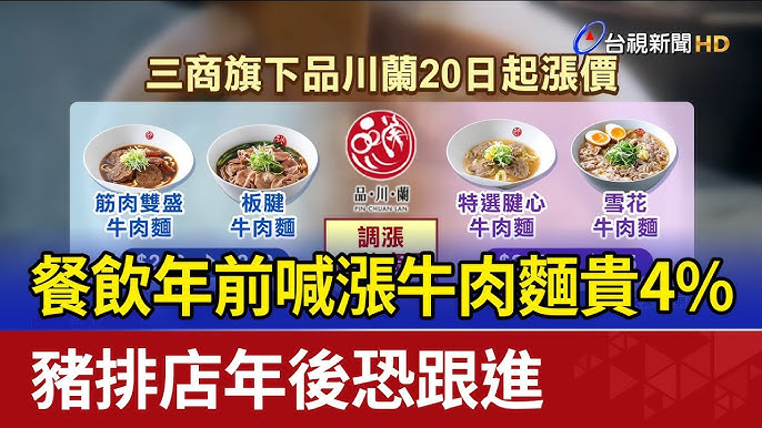 三商餐飲旗下另一品牌「品川蘭」則於2025年初調漲17款牛肉麵商品,漲幅1.7%~4%,例如筋肉雙盛牛肉麵、板腱牛肉麵從250元漲至260元,特選腱心牛肉麵、雪花牛肉麵則從250元漲至255元。業者表示,主要反映牛肉價格近一年漲幅已近四成,豬肉價格也接近歷史高點。