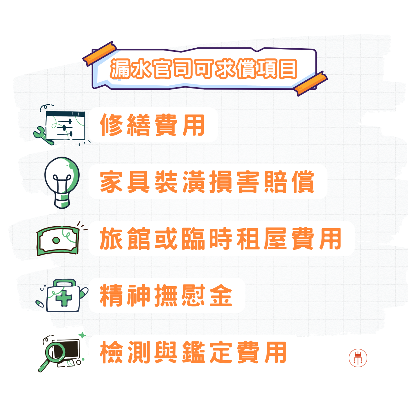 - 如果對方拒絕配合,則可依據漏水情況提起訴訟,要求法院強制對方進行修繕或賠償。
