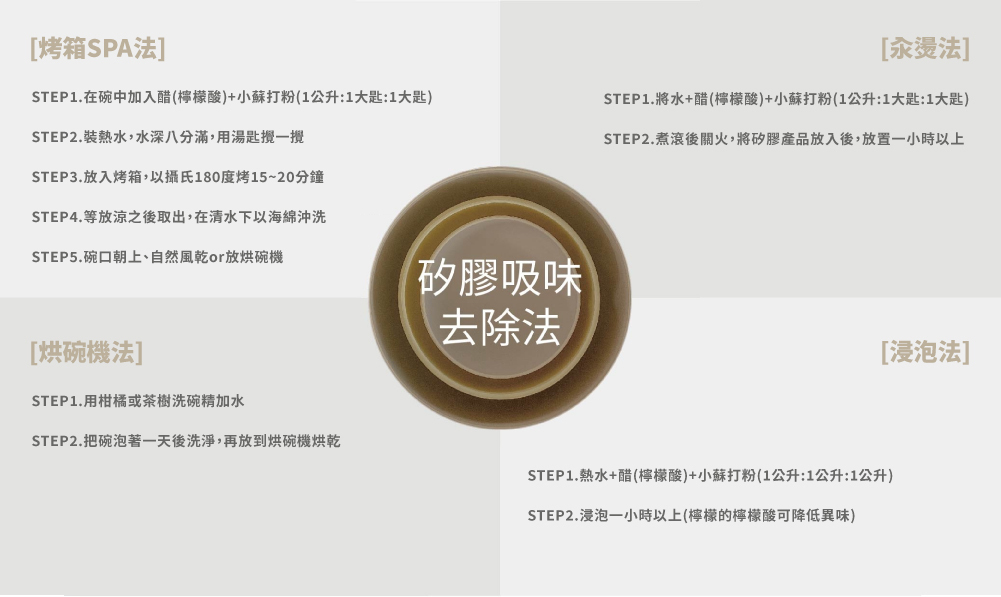 - 利用熱水浸泡:用85度以上熱水沖燙矽膠餐具,打開毛細孔,再用中性清潔劑清洗,能幫助去除油脂與味道。