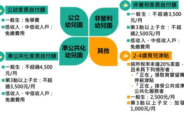 - 公立及非營利幼兒園對中低收入戶家庭從第一胎起即免繳學費。