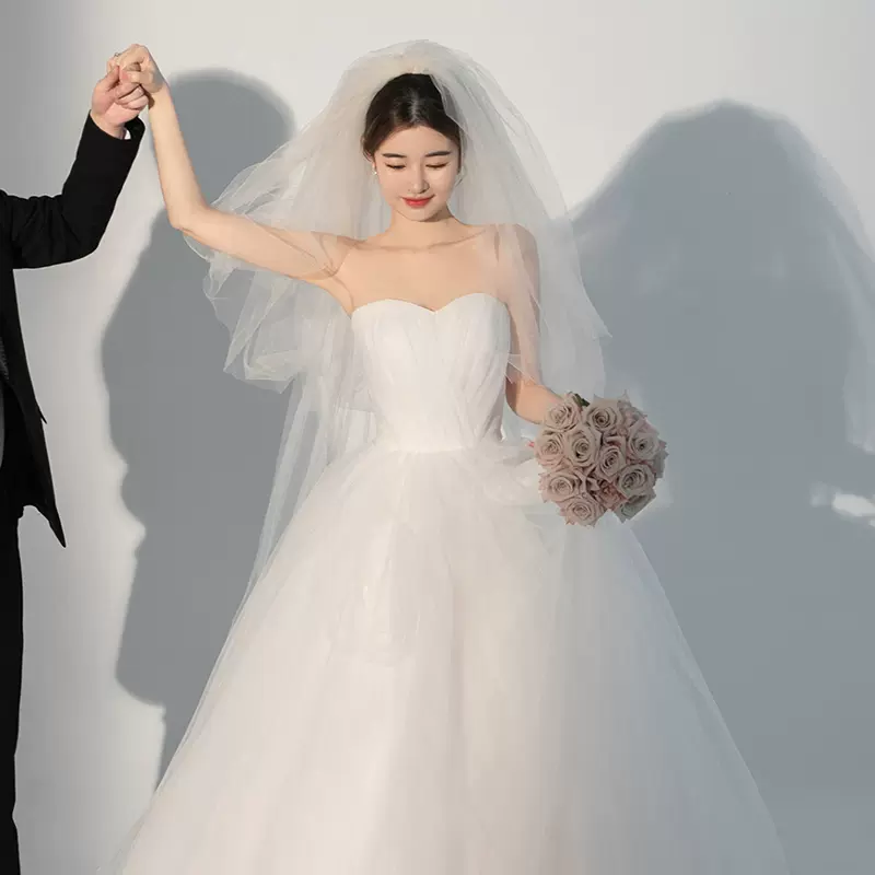 輕薄紗料與多層次裙襬:蛋糕裙、多層次堆疊的輕薄紗裙襬設計,讓婚紗看起來輕盈飄逸,不顯笨重,兼具童話感與舒適度。