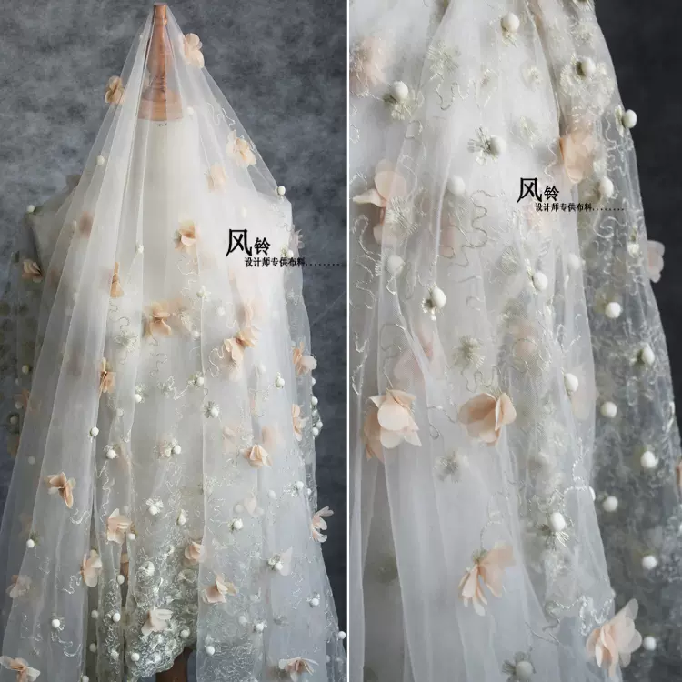 蕾絲:圖案豐富且工藝精細,常用於婚紗的上半身或罩層,能展現細膩浪漫的氛圍。蕾絲觸感柔軟,有輕微浮凸的花紋,適合用於直身或帶小拖尾的款式,但透氣性較差,不太適合炎熱夏季穿著。