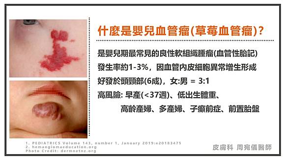 嬰兒型血管瘤(俗稱草莓型血管瘤)通常在出生後2至3週出現,並在1至3個月大時進入快速生長期,此時瘤體直徑與厚度明顯增加,顏色轉為鮮紅,外觀像草莓。約80%的血管瘤在5個月大時結束快速生長,之後進入穩定期,並於1歲後逐漸消退。然而,若血管瘤生長在眼睛、鼻腔、口腔、耳道等影響器官功能的位置,或瘤體過大、容易出血,則需積極治療。