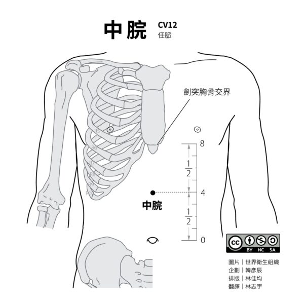 中脘穴 | 肚臍正上方約4指幅(約6公分)處 | 調節消化道機能、消除胃凸和胃脹氣、幫助排便、和胃、寬中、消食 | 用食指或拇指按壓約2~3分鐘,力道適中,以微酸脹感為宜 |