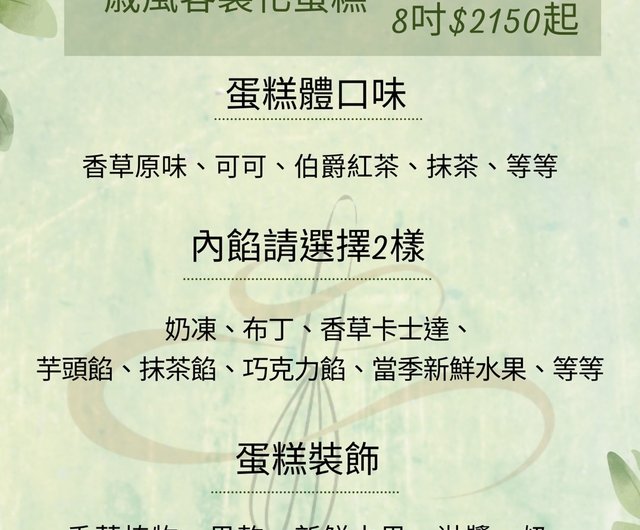 - 客製需求:客製化蛋糕需提前溝通細節,並確認交貨時間與方式。