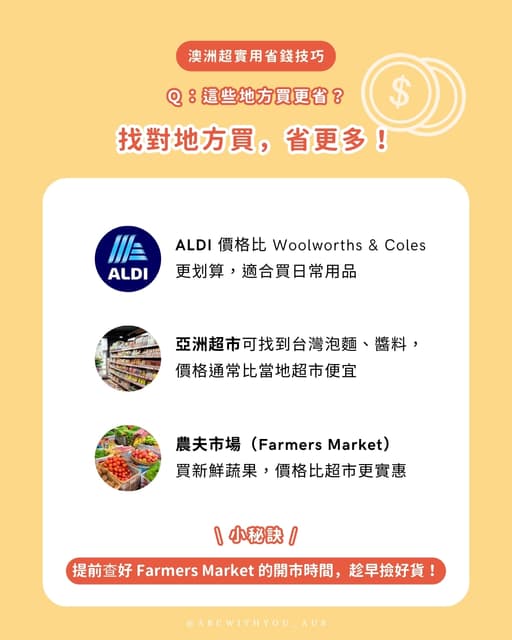 - 利用超市(Coles、Woolworths)打折商品及市集(如Queen Victoria Market)購買食材更划算。