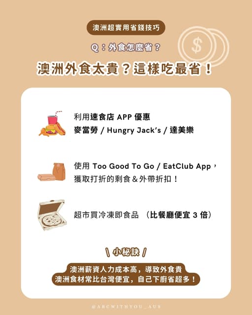 - 自煮是省錢關鍵,每餐約4-6澳幣,月均伙食費約300-500澳幣。