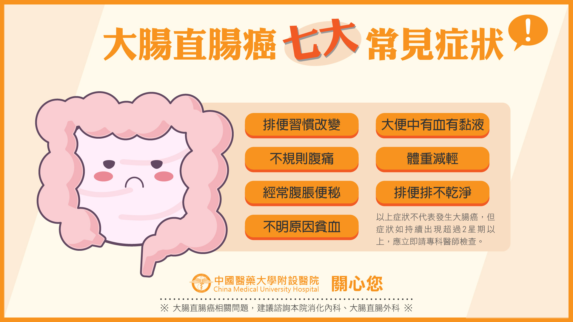 - 就醫時機:無論何種原因,若出現血便、持續腹瀉、體重減輕、發燒等警訊症狀,應儘速就醫。