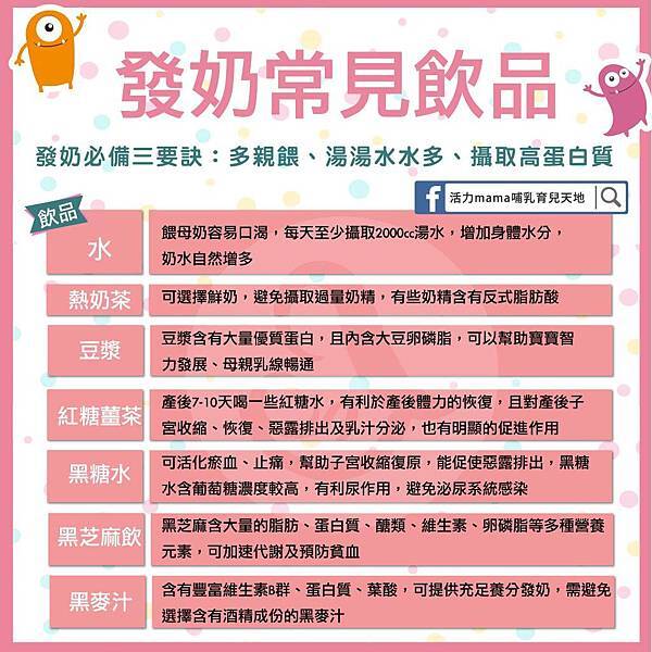 - 避免飲用:含酒精飲料、咖啡因飲料(咖啡、茶、可樂)因可能影響乳汁及寶寶健康。