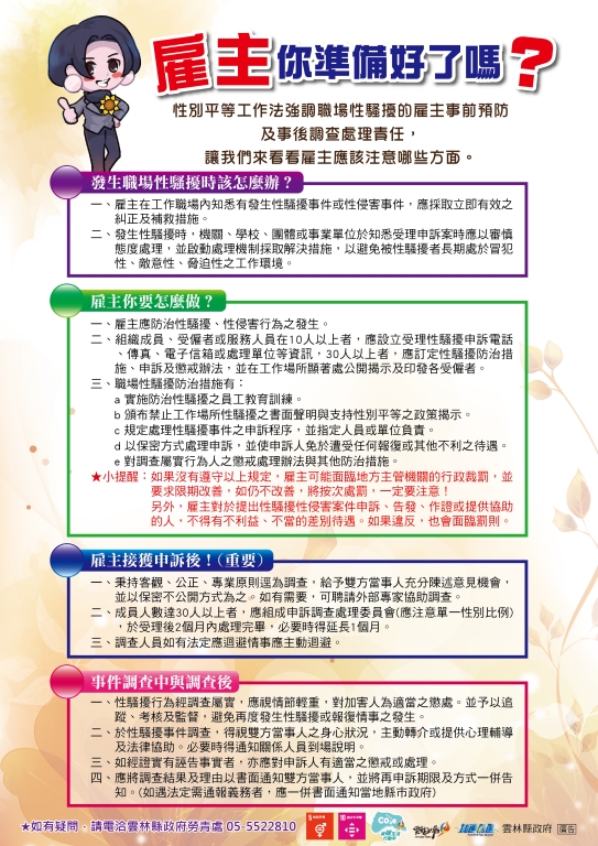 - 人員管理:場所負責人應訂定性騷擾防治措施並公開揭示,組織達一定規模時應設立申訴管道,並定期舉辦防治教育訓練。