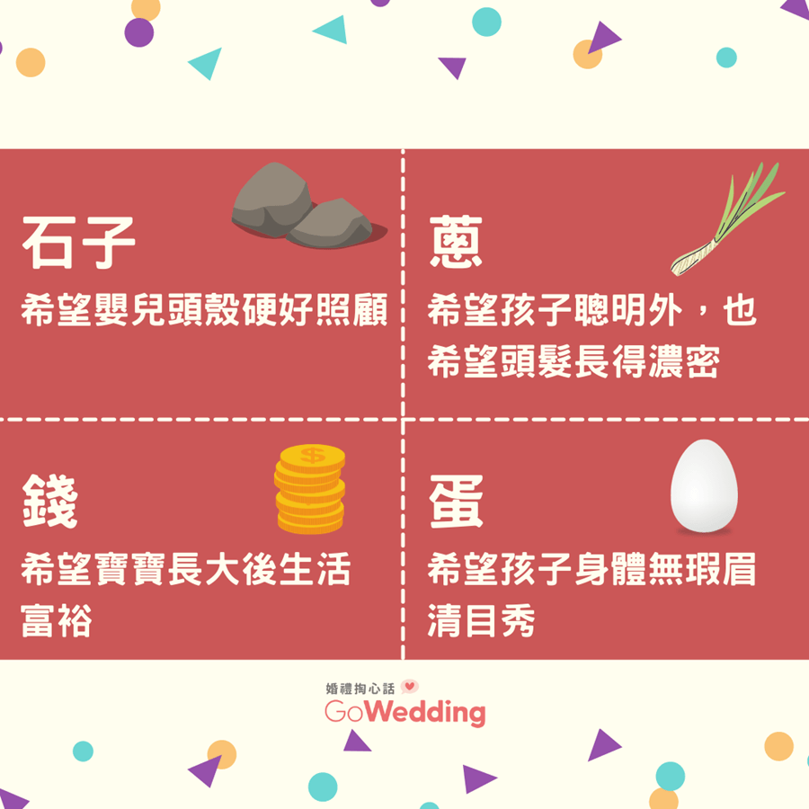 華人(台灣、中國) | 滿月酒宴、分送油飯、紅蛋、蛋糕 | 油飯(多子)、紅蛋(繁衍)、雞腿(強壯)、蛋糕(甜美) | 宴會、送禮、祭祖 |