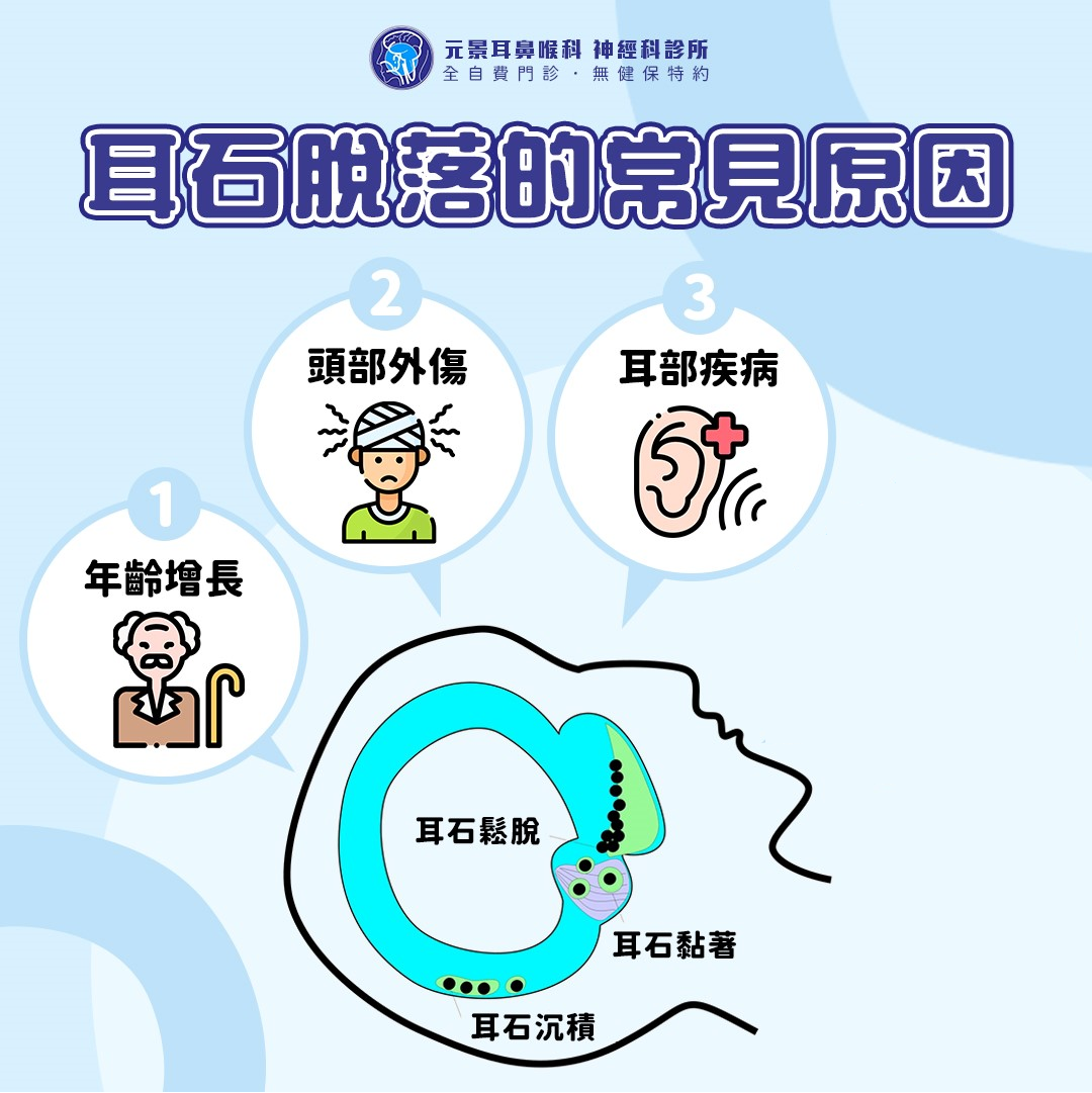 - 自然老化(退化):內耳結構隨年齡退化,耳石容易脫落。