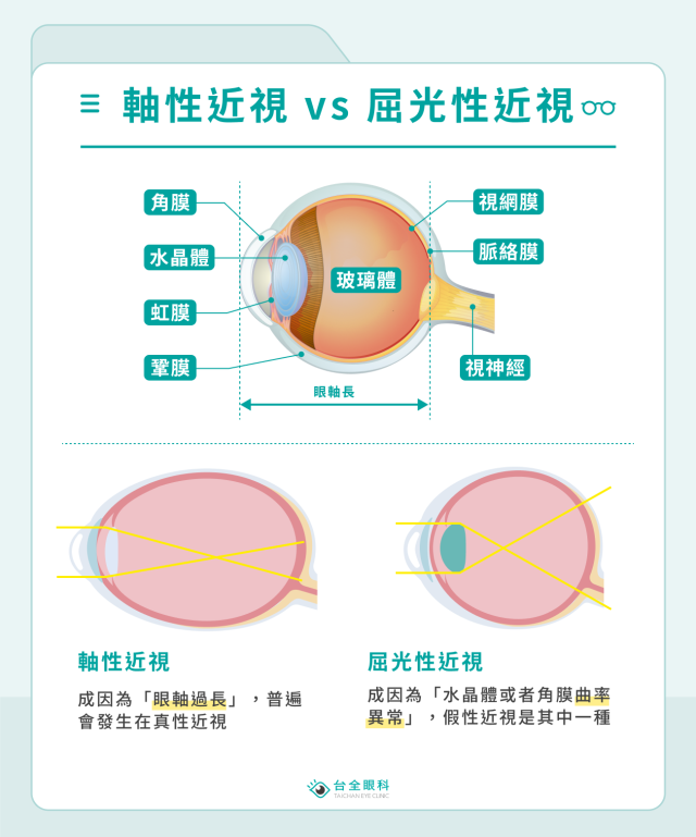 區分假性近視與真性近視:假性近視是因睫狀肌長時間緊繃導致的暫時性近視,散瞳後度數會明顯減少;真性近視則是眼球結構改變,散瞳後度數不會有大幅變化。例如,近視3百度,散瞳後變成2百度,代表有1百度是假性近視。
