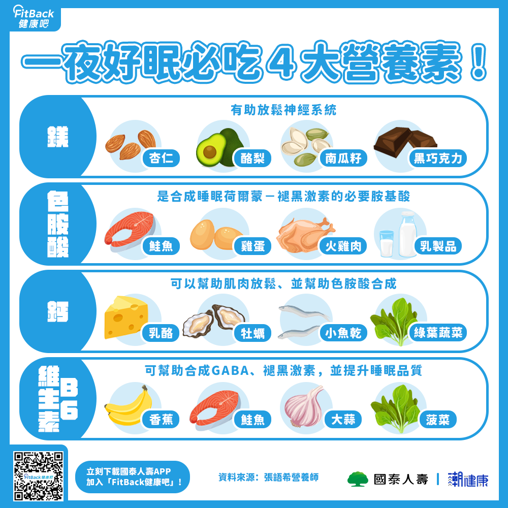 均衡飲食與補充水分:避免睡前大量進食及甜食,減少咖啡因和尼古丁攝取,尤其下午後盡量不喝含咖啡因飲料。多攝取富含色胺酸、維生素B6、B12、鎂的食物,有助睡眠品質。