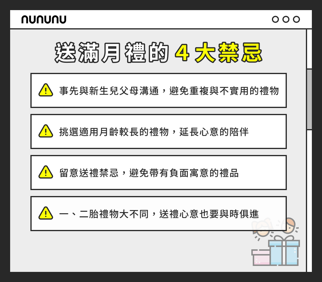 - 考慮成長需求:避免贈送只能短期使用的產品(如尺寸過小的衣物或尿布),建議選擇能伴隨寶寶成長的禮物,或事先詢問家長需求。