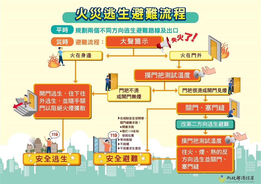 - 隨手關門:逃生時順手關門,可有效阻隔火勢與濃煙蔓延,爭取更多逃生時間。
