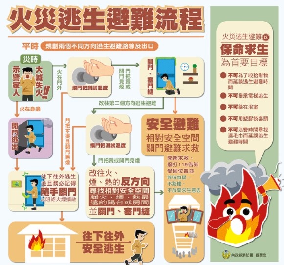 - 逃生口訣:「遇火災,不搭電;走樓梯,最安全」是消防單位一再宣導的重點。