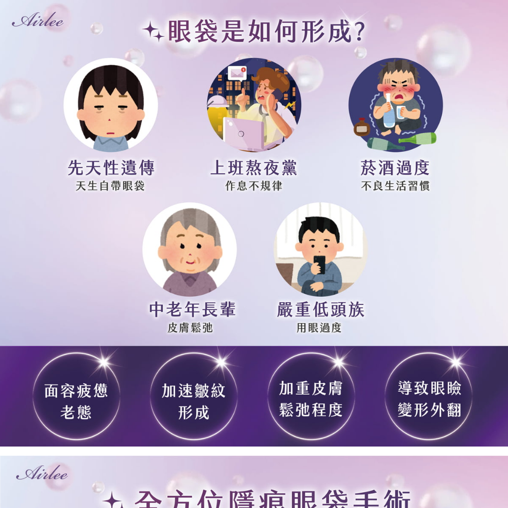 - 長時間使用電子產品:用眼過度增加眼部疲勞和壓力,影響眼周血液循環,促使眼袋產生。