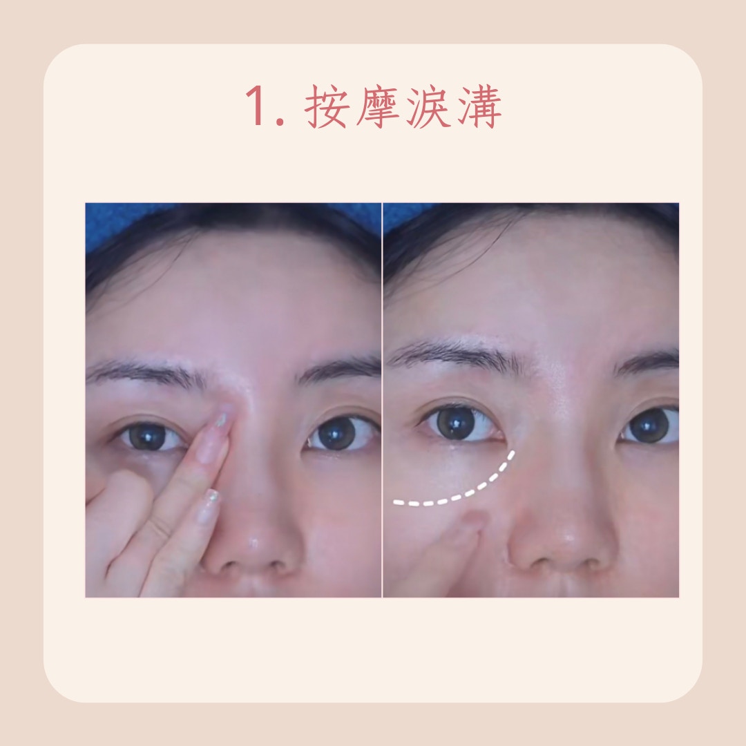 使用溫熱毛巾熱敷眼周,或用手掌搓熱後輕按眼袋,能促進血液循環,幫助排除多餘水分,減少眼袋浮腫。 -