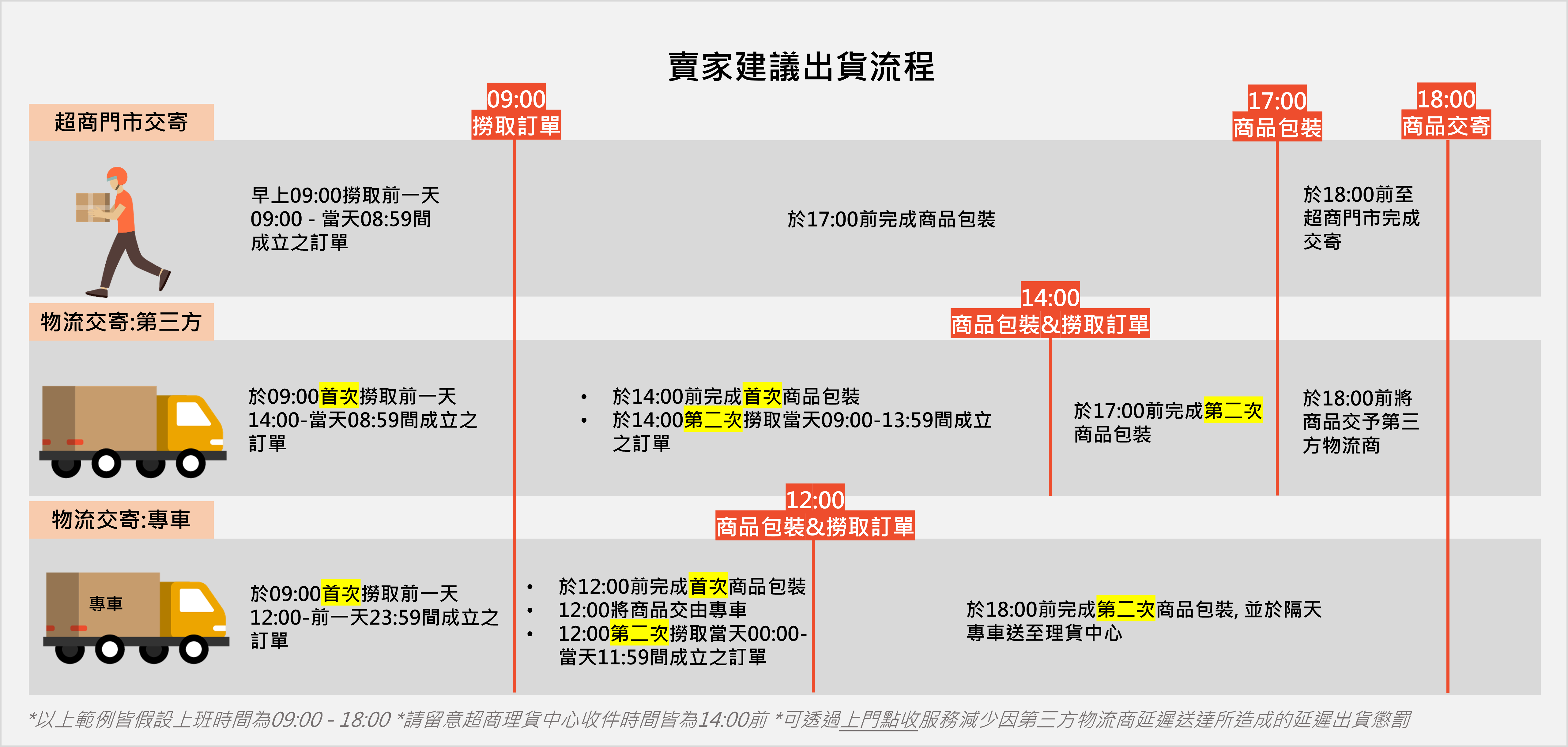 縮短備貨時間:依照蝦皮規定,現貨商品需在1個工作日內完成出貨,賣家需提升備貨效率,或申請「較長備貨」但須付額外手續費。
