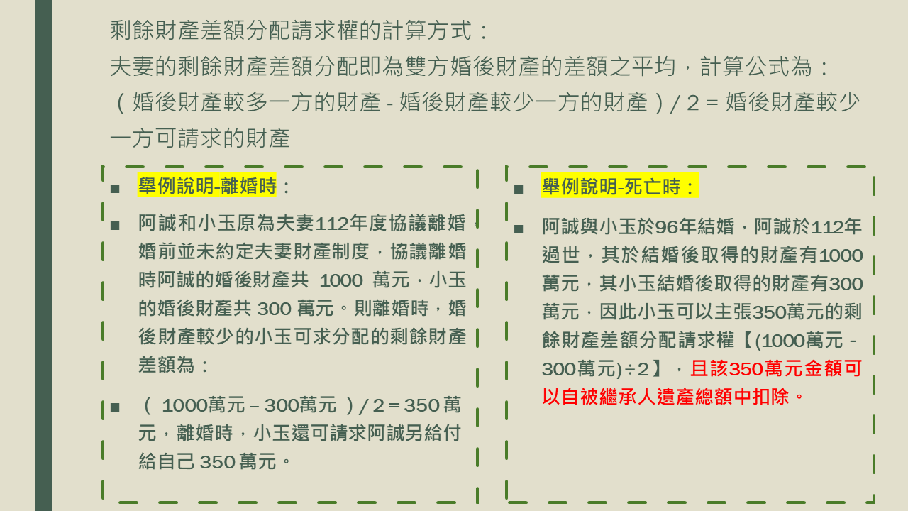 所以,夫妻剩餘財產差額分配請求權是法定財產制下,夫妻關係消滅時保障財產公平分配的重要法律權利,具有明確的計算方式、適用條件及時效限制,並與遺產繼承制度相互配合。