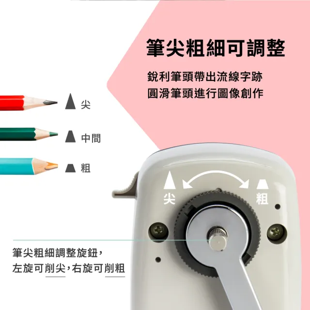 - 適應不同鉛筆種類:可調節筆尖粗細的削鉛筆機能適用於一般木鉛筆、色鉛筆及特殊握筆造型鉛筆,避免筆芯過度削細或斷裂,延長鉛筆使用壽命。