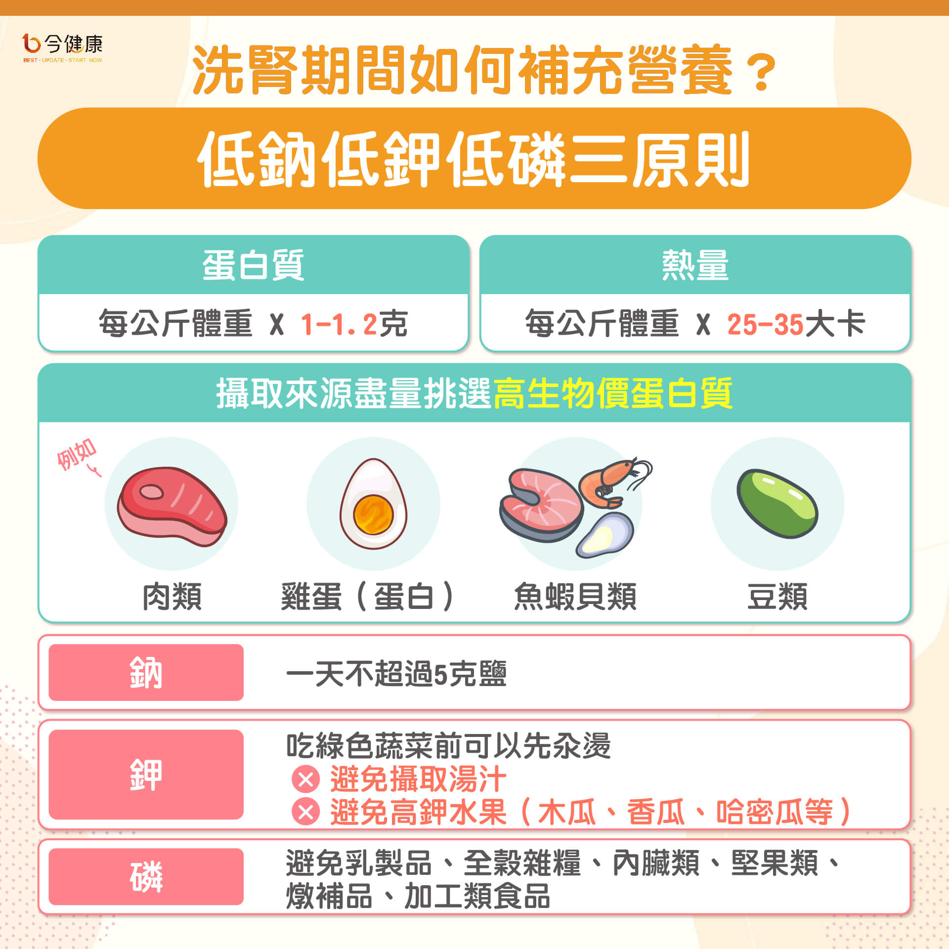 - 洗腎易流失水溶性維生素(如B群、C),建議在醫師或營養師指導下適量補充。